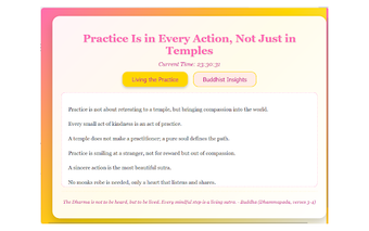 实践存在于每一个行动中是一个Chrome扩展,旨在通过100条名言的集合来促进正念,这些名言分为两个类别:生活实践和佛教洞察。该扩展提供了一个优雅的界面,配有舒缓的粉色、黄色和白色的配色方案,增强了用户体验。用户可以轻松浏览这些以可滚动格式显示的名言,便于快速获取每日灵感。此外,固定的佛陀名言作为正念生活重要性的提醒,丰富了用户通向更高意识的旅程。